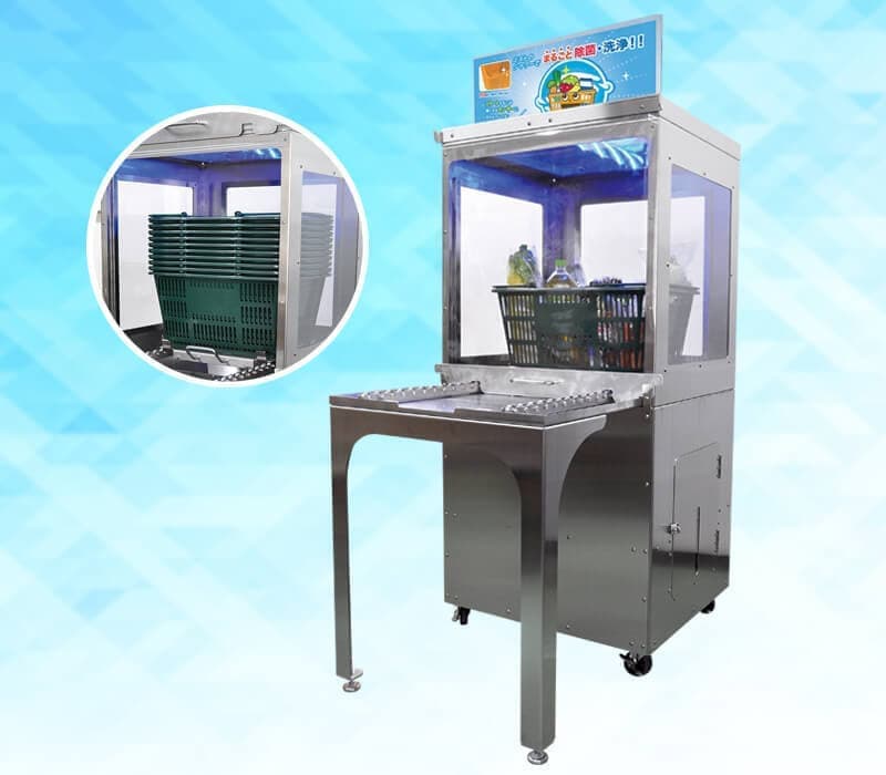 スーパーなどで買い求めた商品(食品や日用品など)を袋詰めをする前にカゴに入れたままセルフ除菌。わずか10秒ほどでカゴごと除菌・洗浄してくれます。また、お客様が利用する買い物カゴを最大10個まで重ねて使用することができます。